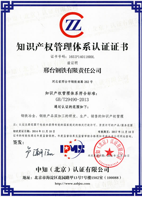 Xing steel through the GB/T29490-2013 certification, and Zhongzhi (Beijing) Limited certification awarded the "intellectual property management system certification certificate" to the corporation.