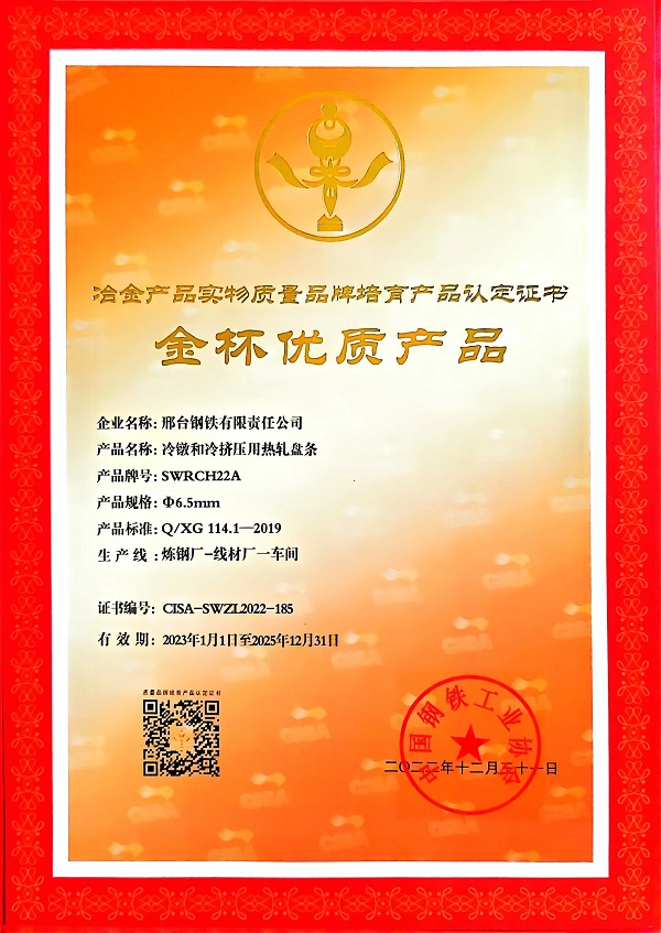 冷鐓和冷擠壓用熱軋盤條SWRCH22Aφ6.5mm規(guī)格獲冶金產(chǎn)品實物質(zhì)量金杯優(yōu)質(zhì)產(chǎn)品認(rèn)定證書
