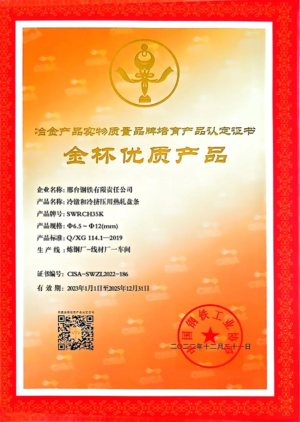 冷鐓和冷擠壓用熱軋盤條SWRCH35Kφ6.5-φ12mm規(guī)格獲冶金產(chǎn)品實物質(zhì)量金杯優(yōu)質(zhì)產(chǎn)品認(rèn)定證書