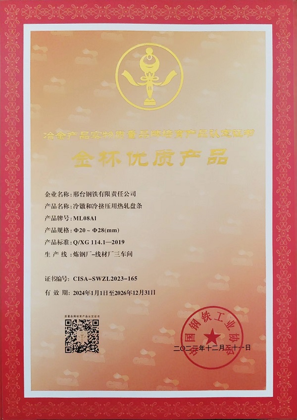 冷鐓和冷擠壓用精品盤條SCM435φ23mm;φ14-φ16mm規(guī)格獲冶金產(chǎn)品實物質(zhì)量金杯優(yōu)質(zhì)產(chǎn)品認(rèn)定證書