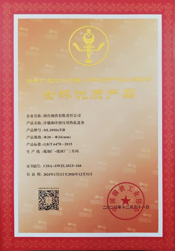 冷鐓和冷擠壓用熱軋盤條ML20MnTiBφ20-φ24mm規(guī)格獲冶金產(chǎn)品實物質(zhì)量金杯優(yōu)質(zhì)產(chǎn)品認(rèn)定證書