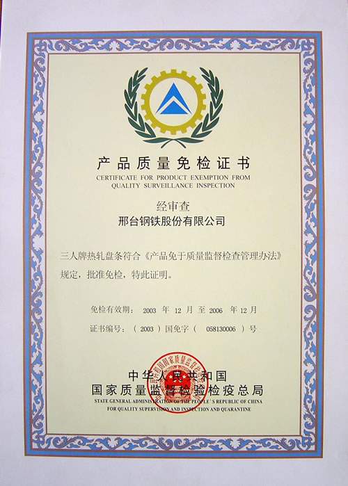 三人牌熱軋盤條產(chǎn)品質(zhì)量免檢證書