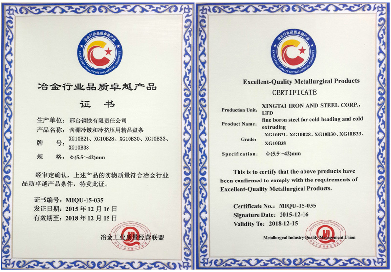 含硼冷鐓和冷擠壓用精品盤條XG10B21、XG10B28、XG10B30、XG10B33、XG10B38φ(5.5~42)mm獲冶金行業(yè)品質卓越產品