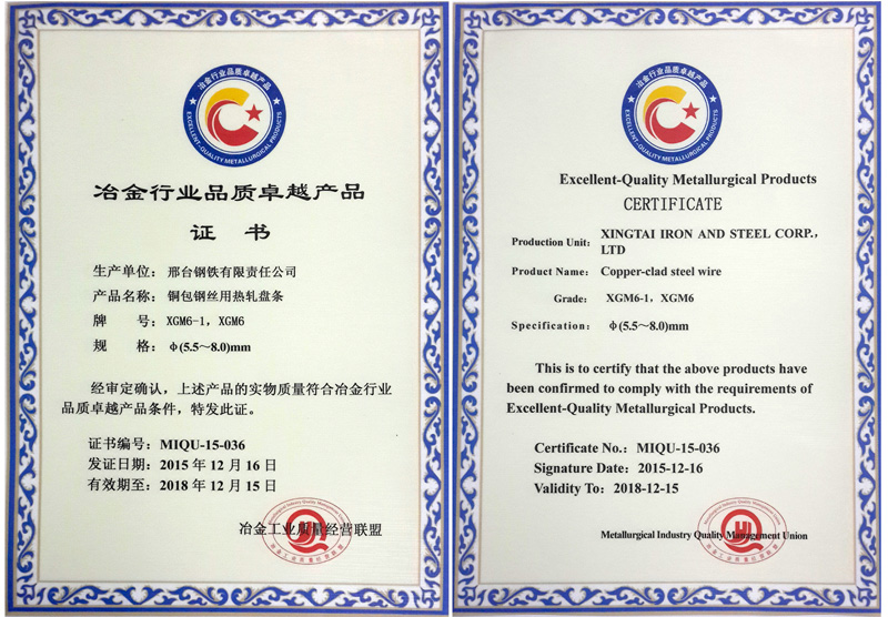 銅包鋼絲用熱軋盤條XGM6-1、XGM6φ(5.5~8.0)mm獲冶金行業(yè)品質卓越產品
