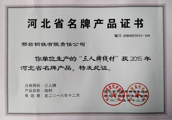“三人牌線材”獲2015年河北省名牌產品