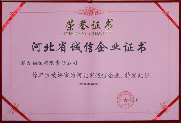 2013年9月,邢鋼被評(píng)選為“河北省誠(chéng)信企業(yè)”。
