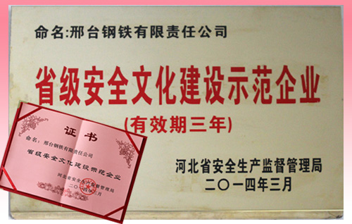 2014年9月10日,河北省安全生產(chǎn)監(jiān)督管理局在全省企業(yè)安全文化建設(shè)交流會(huì)上,授予邢鋼“省級(jí)安全文化建設(shè)示范企業(yè)”稱號(hào)。