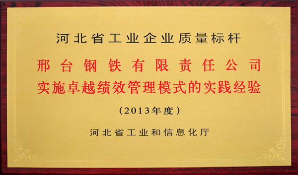 2013年7月12日,省工信廳在石家莊召開了2013年第五期國家新型工業(yè)化產業(yè)示范基地質量標桿經驗交流會,會上舉行了省質量標桿授牌儀式,邢鋼公司參加會議并接受了授牌。