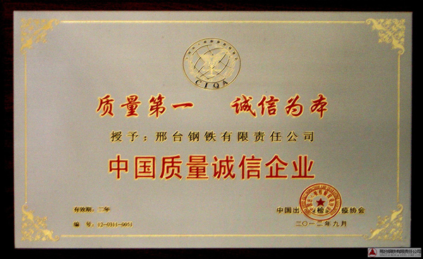 2012年9月,邢鋼被中國出入境檢驗檢疫協(xié)會評為“中國質量誠信企業(yè)”,并頒發(fā)獎牌。