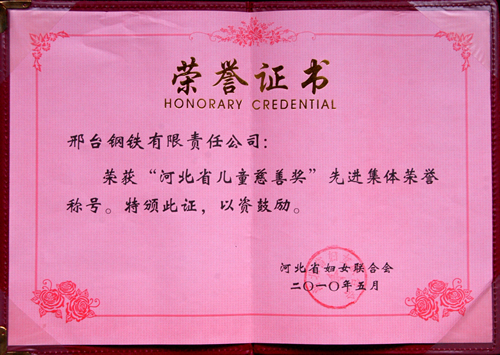 2010年5月,邢鋼榮獲“河北省兒童慈善獎(jiǎng)”先進(jìn)集體榮譽(yù)稱號。