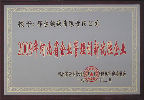 2009年12月,邢鋼榮獲“2009年河北省企業(yè)管理創(chuàng)新優(yōu)勝企業(yè)”榮譽(yù)稱號。