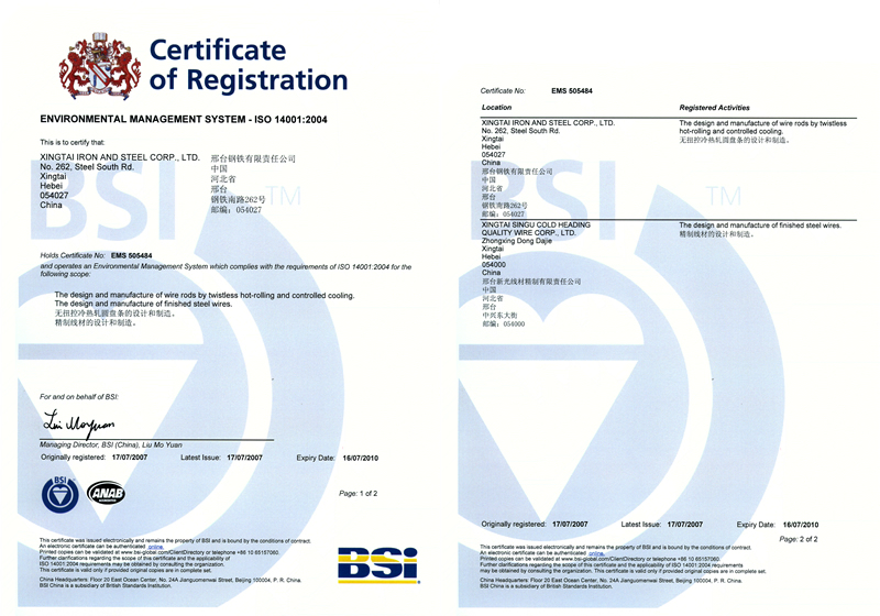 2007年7月17日,邢鋼獲ISO 14001:2004認(rèn)證證書(環(huán)境管理體系要求及使用指南)。