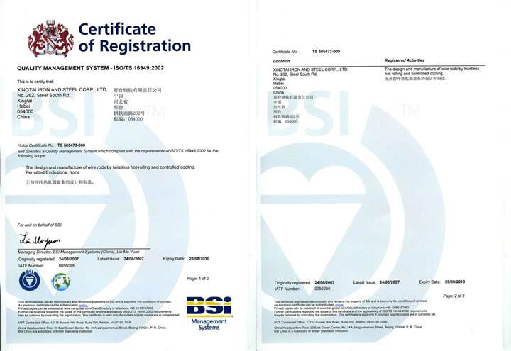 2007年8月24日,邢鋼獲ISO/TS 16949:2002認(rèn)證證書(國(guó)際汽車行業(yè)質(zhì)量管理體系認(rèn)證)。