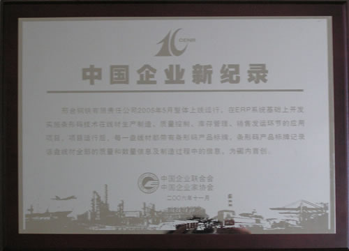 2006年11月,邢臺鋼鐵有限責任公司2005年整體上線運行,在ERP系統(tǒng)基礎(chǔ)上開發(fā)實施條行碼技術(shù)在線材生產(chǎn)制造、質(zhì)量控制、庫存管理、銷售發(fā)運環(huán)節(jié)的應(yīng)用項目,項目運行后每一條線材都帶有條型碼產(chǎn)品標牌,條型碼產(chǎn)品標牌記錄該盤線材全部的質(zhì)量和數(shù)量信息及制造過程中的信息,為國內(nèi)首創(chuàng)。