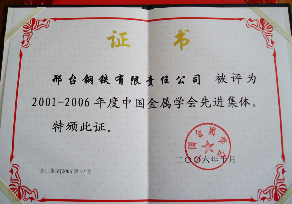 2006年10月,邢鋼榮獲中國金屬學會先進集體證書。