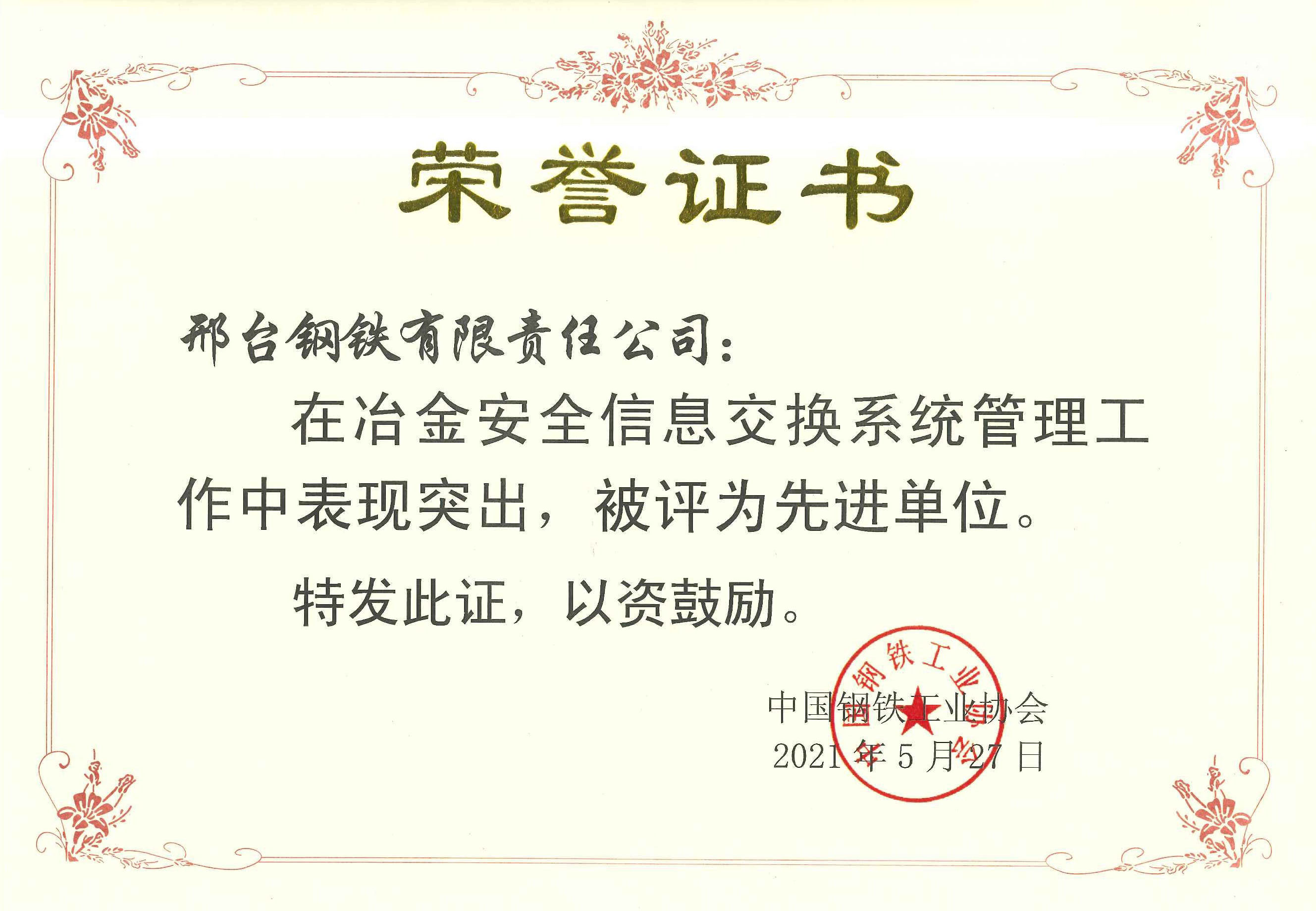 近日,邢臺鋼鐵有限責(zé)任公司(以下簡稱邢鋼)收到中鋼協(xié)〔2021〕73 號文《關(guān)于表彰冶金安全信息交換系統(tǒng)管理工作先進(jìn)單位和先進(jìn)個人的決定》及榮譽(yù)證書,邢鋼在冶金安全信息交換系統(tǒng)管理工作中表現(xiàn)突出,被評為先進(jìn)單位。