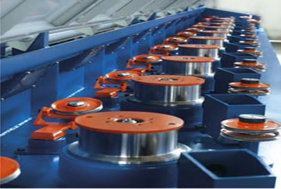 2、線材由放線機(jī)進(jìn)入拉絲機(jī)。經(jīng)過十一次拉拔和十一次卷筒冷卻,實現(xiàn)Φ2.1mm線材到Φ0.6mm線材的軋制。模具采用直接水冷。模具的裝填是直接從頂部裝填,非常方便且節(jié)約時間,和普通的模具盒一樣。在最后一個卷筒后面,裝有一個舞臂單元,使拉絲機(jī)和收線機(jī)/收卷機(jī)保持同步。