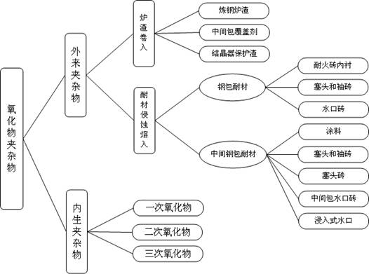 而外來夾雜主要是在鋼的熔煉、出鋼和澆鑄過程中,鋼液同耐火材料和爐渣相接觸,爐渣被卷入鋼液中(特別是出鋼的時候),耐火材料在高溫收到?jīng)_蝕,它的顆?;烊脘撘褐?,這些情況都難以避免?;烊脘撘褐械哪突鸩牧虾蜖t渣顆粒通過與鋼液起化學反應不斷在成分和結構上發(fā)生變化。這些顆粒,不論是剛剛被機械地帶入鋼液中的,還是經(jīng)歷了相當變化的,一旦被滯留到鑄件中,就變成了鋼中的夾雜物,這些就叫外來夾雜物。外來一般來說尺寸較大,外形不規(guī)則,結構復雜,只是偶然在這里或者那里出現(xiàn)。夾雜物的來源和分類下圖。