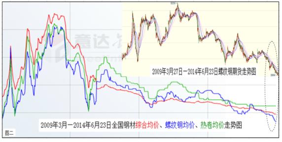 底線的提高,勢(shì)必助推中國(guó)經(jīng)濟(jì)大勢(shì)呈現(xiàn)前低后高的走勢(shì)。而經(jīng)過(guò)長(zhǎng)期低迷的中國(guó)鋼材市場(chǎng),也已經(jīng)具備逐漸走強(qiáng)的兩大要素:一是鋼市走強(qiáng)的外在環(huán)境趨好(見上圖一)。包括上半年推出一系列微刺激效應(yīng)逐漸顯現(xiàn),下半年由于經(jīng)濟(jì)增長(zhǎng)底線提高,以及持續(xù)加推的動(dòng)力措施等合成發(fā)酵,定會(huì)形成遠(yuǎn)比上半年良好的鋼市發(fā)展環(huán)境;二是鋼市走強(qiáng)的內(nèi)在動(dòng)能充沛(下圖二)。鋼材價(jià)格經(jīng)過(guò)長(zhǎng)期下跌后,已經(jīng)下穿了所有的技術(shù)阻力位,使業(yè)內(nèi)根本無(wú)法從技術(shù)面進(jìn)行詮釋。但從價(jià)值規(guī)律、市場(chǎng)規(guī)律以及基本面情況看,目前鋼材價(jià)格的底部特征已經(jīng)十分明顯,空方量能也已近衰竭。因此,經(jīng)過(guò)短時(shí)間的整固蓄勢(shì)后,震蕩上揚(yáng)應(yīng)該是后期運(yùn)行的主基調(diào)。如果再結(jié)合宏觀上經(jīng)濟(jì)增長(zhǎng)底線的提高,下半年鋼材價(jià)格恢復(fù)性上揚(yáng)既在情理之中,也是勢(shì)所必然。所以,基于經(jīng)濟(jì)和鋼市大勢(shì)筆者作出,下半年全國(guó)鋼材價(jià)格勢(shì)必高于上半年的預(yù)測(cè)。