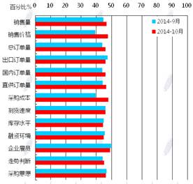 蘭格鋼鐵信息研究中心統(tǒng)計(jì)發(fā)布2014年10月鋼鐵流通業(yè)PMI總指數(shù)為47.8,環(huán)比微升0.6個(gè)百分點(diǎn)(見圖1),顯示鋼鐵流通市場活躍度略有好轉(zhuǎn)。從各項(xiàng)分指數(shù)看,10月份鋼鋼鐵流通業(yè)PMI調(diào)查的10項(xiàng)分指數(shù)5升5降。其中,企業(yè)銷量增加,下游訂單增加,但企業(yè)對后市較為謹(jǐn)慎,采購意愿未增(見圖2)??傮w判斷11月鋼鐵流通市場需求景氣微升。