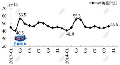 =鋼鐵市場活躍度略有好轉(zhuǎn)。10月銷售量指數(shù)為46.6%,較上月上升2.1個(gè)百分點(diǎn)(見圖3),表明10月份鋼貿(mào)企業(yè)銷售量增加,鋼鐵流通市場活躍度略有好轉(zhuǎn)。進(jìn)入10月,隨著鋼鐵原料鐵礦石及鋼坯價(jià)格的先漲后跌,鋼材市場價(jià)格也呈現(xiàn)先漲后跌走勢,市場成交總體有所好轉(zhuǎn)。從區(qū)域看,六大區(qū)域銷售量指數(shù)除東北、西北地區(qū)有所下降外,其余地區(qū)均出現(xiàn)不同程度的回升。