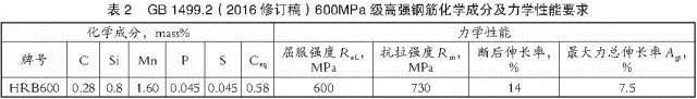 目前國內(nèi)有沙鋼、承鋼和濟鋼等鋼廠具備成功生產(chǎn)600MPa級熱軋螺紋鋼筋的經(jīng)驗。表2為GB l499.2(2016修訂稿)對600MPa級高強鋼筋HRB600化學成分和力學性能的要求。