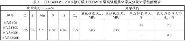 GB l499.2(2016修訂稿)規(guī)定HRB500的化學成分和碳當量應符合表1的要求,并根據(jù)需要鋼中還可以加入釩、鈮、鈦等元素。