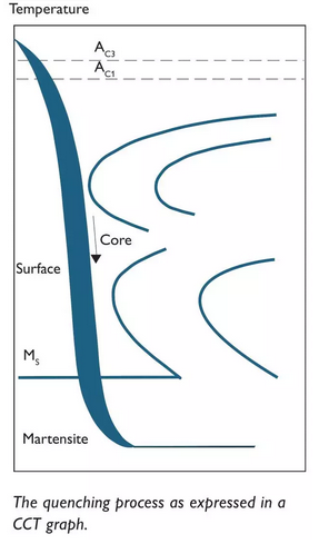 不良的淬火速率將導致在部件芯部的晶粒邊界處的碳化物沉淀,并且這對鋼的機械性能非常不利的。此外,對于具有較大橫截面的工具,較大部件的表面處所獲得的硬度可以比較小部件的更低,因為從芯部傳遞至表面的大量熱量會產生自回火效應。
