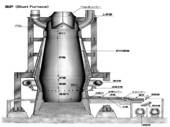 高爐是煉鐵設(shè)備,是鋼鐵冶煉的第一道工序,即鐵礦石須經(jīng)高爐冶煉后才能得到各種類用途的生鐵塊,或供煉鋼使用的鐵水。高爐外殼是鋼板,殼內(nèi)砌耐火磚內(nèi)襯,爐殼和耐火材料之間有冷卻設(shè)備。高爐本體自上而下分為爐喉、爐身、爐腰、爐腹、爐缸5個部分。