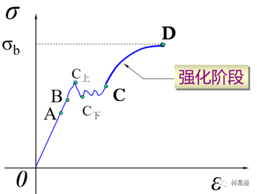 經(jīng)過屈服階段后,曲線從C點(diǎn)又開始逐漸上升,說明要使應(yīng)變?cè)黾?,必須增加?yīng)力,材料又恢復(fù)了抵抗變形的能力,這種現(xiàn)象稱作強(qiáng)化,CD段稱為強(qiáng)化階段(加工硬化)。