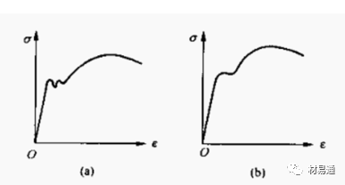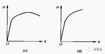 b中碳鋼的應(yīng)力-應(yīng)變曲線,它有屈服階段,但波動(dòng)微小,幾乎成一條直線,均勻塑性變形后產(chǎn)生縮頸,然后試樣斷裂。