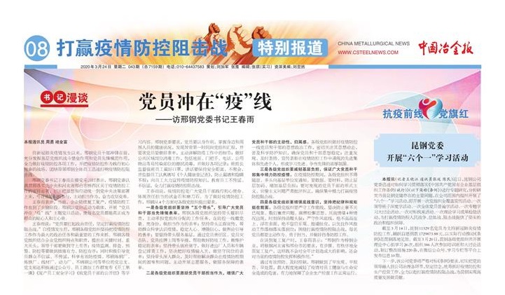 自新冠肺炎疫情發(fā)生以來,邢鋼黨員干部沖鋒在前,充分發(fā)揮基層黨組織戰(zhàn)斗堡壘作用和黨員先鋒模范作用,全力做好疫情防控各項(xiàng)工作,并把疫情防控作為踐行初心使命的戰(zhàn)場,團(tuán)結(jié)帶領(lǐng)邢鋼全體員工迅速打響疫情防控阻擊戰(zhàn)。