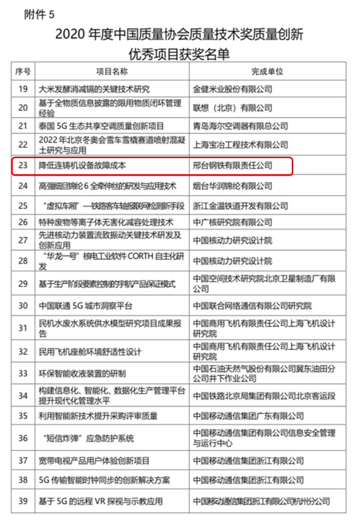 近日,從中國質(zhì)量協(xié)會獲悉,前期經(jīng)中質(zhì)協(xié)推薦,邢鋼公司申報(bào)的《降低連鑄機(jī)設(shè)備故障成本》項(xiàng)目榮獲“2020年度中國質(zhì)量協(xié)會質(zhì)量技術(shù)獎(jiǎng)質(zhì)量創(chuàng)新優(yōu)秀項(xiàng)目獎(jiǎng)”,邢鋼公司作為唯一的鋼鐵企業(yè)榮登獲獎(jiǎng)名單。
