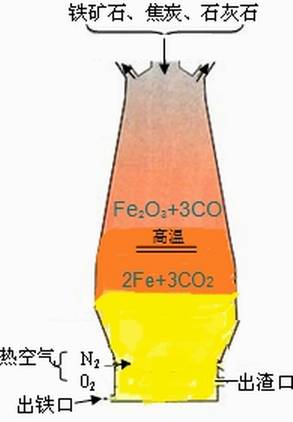高爐生產(chǎn)時(shí),從爐頂裝入鐵礦石、焦炭、造渣用熔劑(石灰石),從位于爐子下部沿爐周的風(fēng)口吹入經(jīng)預(yù)熱的空氣。在高溫下焦炭中的碳同鼓入空氣中的氧燃燒生成的一氧化碳和氫氣,在爐內(nèi)上升過(guò)程中除去鐵礦石中的氧,從而還原得到鐵。煉出的鐵水從鐵口放出。
