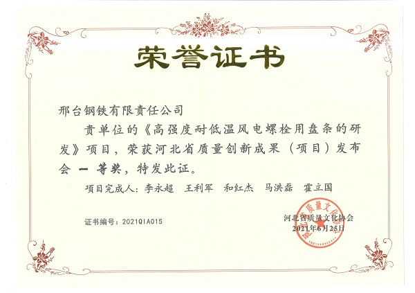 近日,由河北省質(zhì)量文化協(xié)會主辦的“河北省第四屆質(zhì)量創(chuàng)新成果(項目)發(fā)布會”在秦皇島召開,邢鋼精益六西格瑪代表團(tuán)3個成果入圍發(fā)布會名單,其中《高強(qiáng)度耐低溫風(fēng)電螺栓用盤條的研發(fā)》和《提高不銹鋼1Cr13澆次連澆爐數(shù)》榮獲一等獎,《提高Q55SiCrA-1線材成材率》榮獲二等獎。