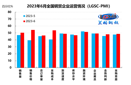 蘭格鋼鐵網(wǎng)統(tǒng)計(jì)發(fā)布的2023年6月份鋼鐵流通業(yè)PMI總指數(shù)為49.6%,比上月上升1.8個(gè)百分點(diǎn),在收縮區(qū)間內(nèi)繼續(xù)回升。從分類指數(shù)看,構(gòu)成鋼鐵流通業(yè)PMI的10個(gè)分類指數(shù)6升3降1平,其中銷售量、銷售價(jià)格、總訂單量、采購(gòu)成本、走勢(shì)判斷和采購(gòu)意愿6項(xiàng)指數(shù)上升,到貨速度、庫(kù)存水平和融資環(huán)境3項(xiàng)指數(shù)下降,企業(yè)雇員1項(xiàng)指數(shù)持平。