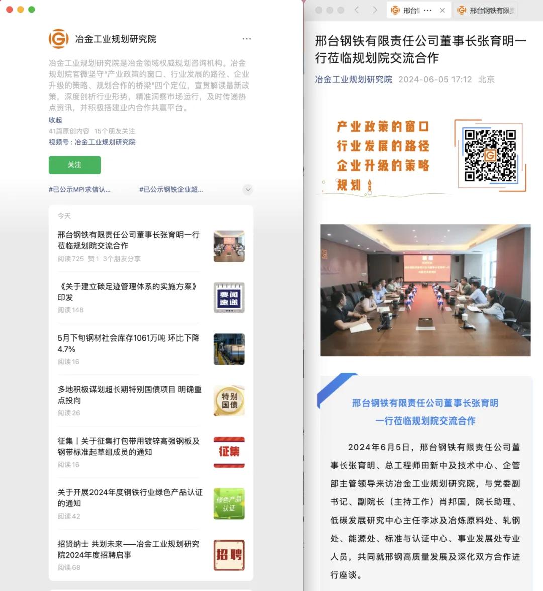 2024年6月5日,邢臺鋼鐵有限責(zé)任公司黨委書記、董事長張育明在總工程師兼董事長、總經(jīng)理助理田新中及技術(shù)中心、企管部相關(guān)負(fù)責(zé)人的陪同下,到訪冶金工業(yè)規(guī)劃研究院,與黨委副書記、副院長(主持工作)肖邦國,院長助理、低碳發(fā)展研究中心主任李冰及冶煉原料處、軋鋼處、能源處、標(biāo)準(zhǔn)與認(rèn)證中心、事業(yè)發(fā)展處專業(yè)人員,共同就邢鋼高質(zhì)量發(fā)展及深化雙方合作進行座談。
