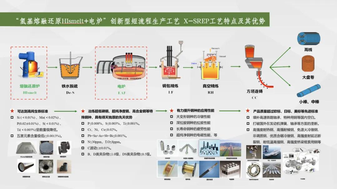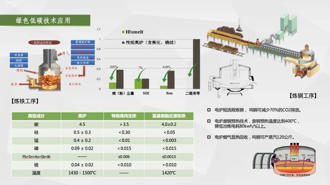一是布局“碳達峰、碳中和”,實現綠色化,引領品牌可持續(xù)發(fā)展。采用的“熔融還原+電爐煉鋼”短流程工藝,取消了燒結、球團、焦化、預還原等工藝環(huán)節(jié),為世界首創(chuàng);和長流程工藝相比,預計可減少二氧化硫、氮氧化物排放38%,減少顆粒物排放89%,建廠即達到A級企業(yè)標準,實現綠色冶金,對我國乃至世界鋼鐵行業(yè)發(fā)展具有創(chuàng)新性和引領示范的意義,是鋼鐵行業(yè)綠色轉型的典范。