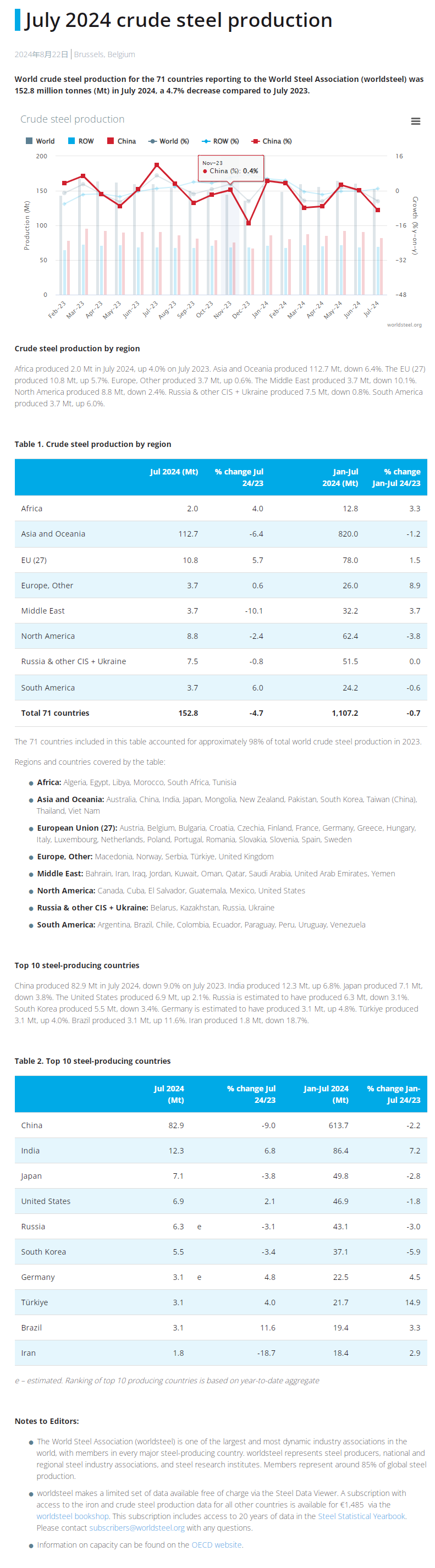 來源:世界鋼鐵協(xié)會(huì) 發(fā)布時(shí)間:2024年08月27日 點(diǎn)擊數(shù):