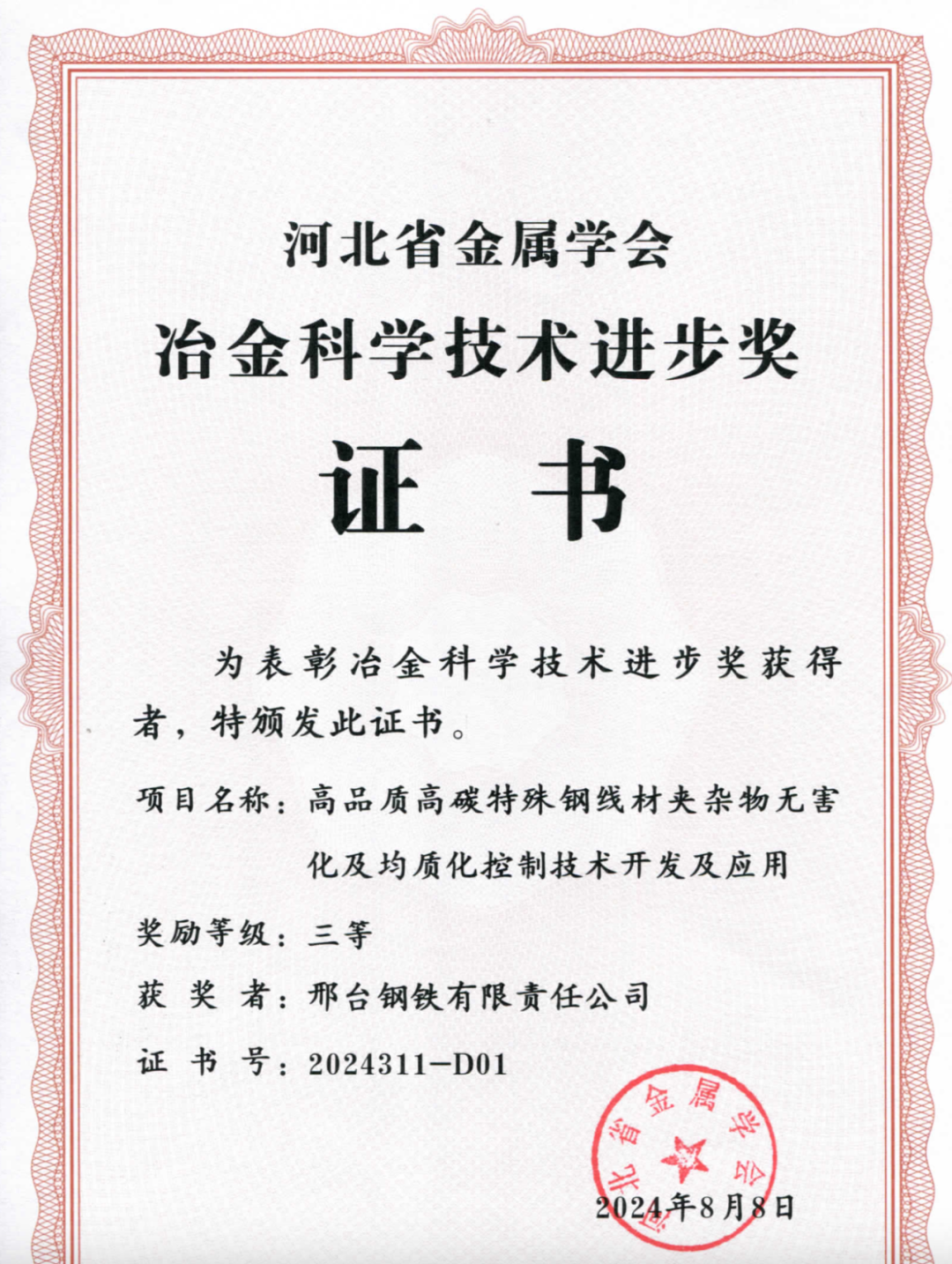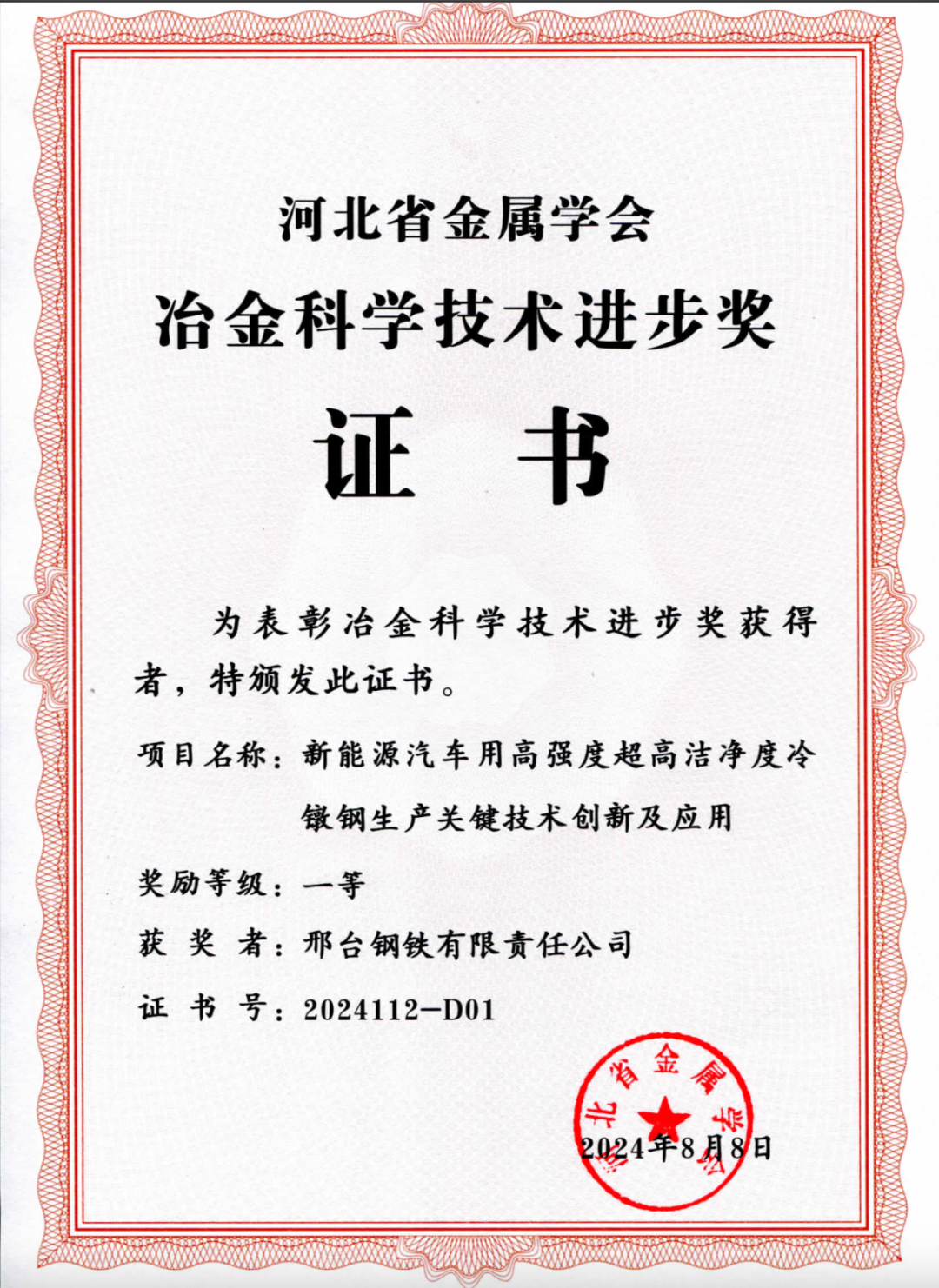 近日,邢臺(tái)鋼鐵有限責(zé)任公司兩項(xiàng)科技成果“新能源汽車用高強(qiáng)度超高潔凈度冷鐓鋼生產(chǎn)關(guān)鍵技術(shù)創(chuàng)新及應(yīng)用”“高品質(zhì)高碳特殊鋼線材夾雜物無害化及均質(zhì)化控制技術(shù)開發(fā)及應(yīng)用”得到河北省金屬學(xué)會(huì)專家評(píng)審委員會(huì)的高度認(rèn)可,分別榮獲2024年度 “河北冶金科學(xué)技術(shù)獎(jiǎng)”一、三等獎(jiǎng)。