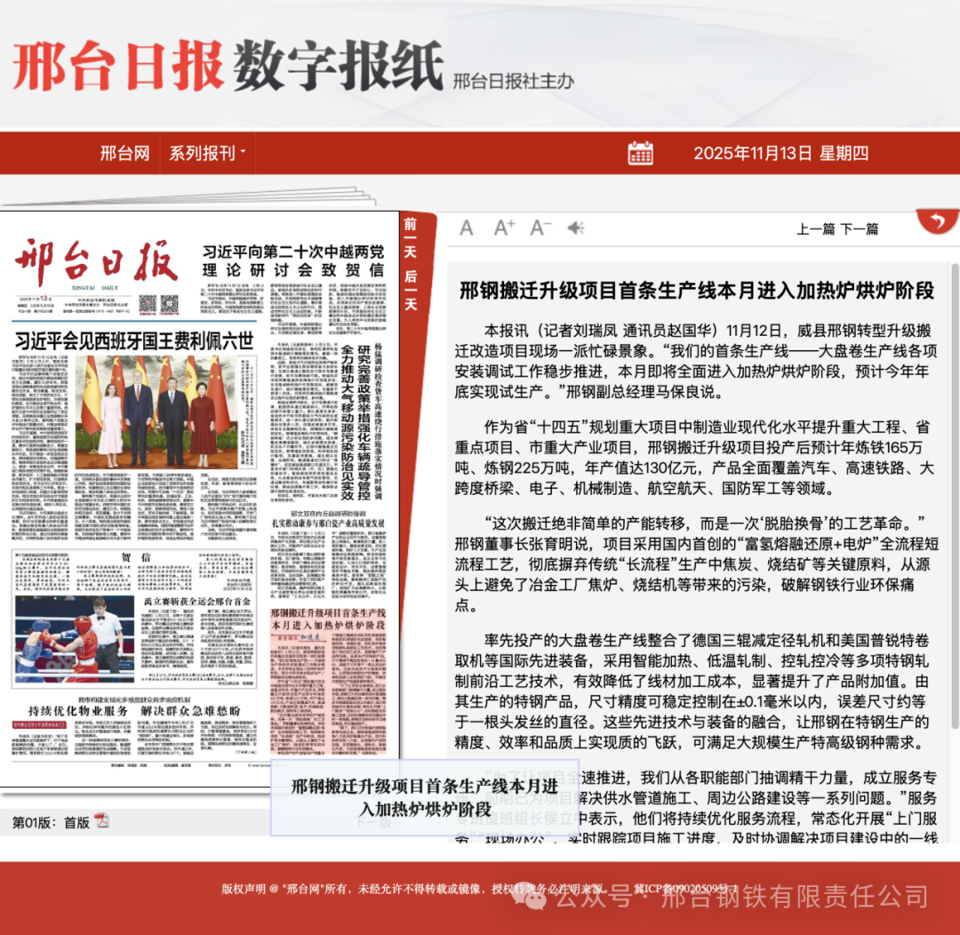 率先投產(chǎn)的大盤卷生產(chǎn)線整合了德國(guó)三輥減定徑軋機(jī)和美國(guó)普銳特卷取機(jī)等國(guó)際先進(jìn)裝備,采用智能加熱、低溫軋制、控軋控冷等多項(xiàng)特鋼軋制前沿工藝技術(shù),有效降低了線材加工成本,顯著提升了產(chǎn)品附加值。由其生產(chǎn)的特鋼產(chǎn)品,尺寸精度可穩(wěn)定控制在±0.1毫米以內(nèi),誤差尺寸約等于一根頭發(fā)絲的直徑。這些先進(jìn)技術(shù)與裝備的融合,讓邢鋼在特鋼生產(chǎn)的精度、效率和品質(zhì)上實(shí)現(xiàn)質(zhì)的飛躍,可滿足大規(guī)模生產(chǎn)特高級(jí)鋼種需求。“為了讓項(xiàng)目全速推進(jìn),我們從各職能部門抽調(diào)精干力量,成立服務(wù)專班,前期已為項(xiàng)目解決供水管道施工、周邊公路建設(shè)等一系列問題。”服務(wù)專班值班組長(zhǎng)侯立中表示,他們將持續(xù)優(yōu)化服務(wù)流程,常態(tài)化開展“上門服務(wù)”“現(xiàn)場(chǎng)辦公”,實(shí)時(shí)跟蹤項(xiàng)目施工進(jìn)度,及時(shí)協(xié)調(diào)解決項(xiàng)目建設(shè)中的一線難題,保障項(xiàng)目按時(shí)間節(jié)點(diǎn)高效推進(jìn),早日建成投產(chǎn)。“眼下,我們正對(duì)標(biāo)國(guó)內(nèi)首鋼智新等先進(jìn)企業(yè),瞄準(zhǔn)高強(qiáng)度耐熱鋼等八大系列的高精尖產(chǎn)品,加大科技研發(fā)投入力度,全面提升產(chǎn)品附加值,實(shí)現(xiàn)高端化、綠色化、智能化升級(jí),為我國(guó)高端裝備制造業(yè)提供關(guān)鍵材料支撐。”馬保良說。